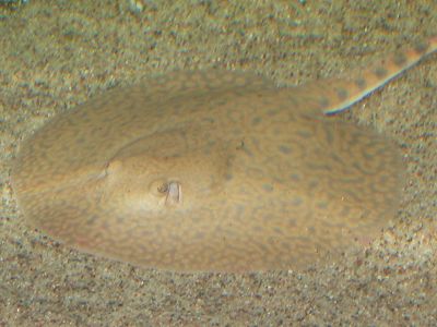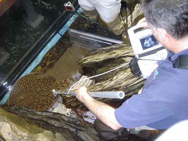 In early December, 2004 we observed chew marks on the margins of the disc of our largest female. Around the same time her appetite appeared to increase. In January, we began to suspect that she was pregnant. Eight weeks after mating we dropped the water level on the exhibit, and preformed an ultrasound procedure in the corner of the exhibit. This was done on the suspected female, and confirmed that she was pregnant. Only one pup was observed at this time. We repeated the ultrasound 11 weeks later, and again saw a single pup. During the time of the pregnancy the female’s appetite increased by quite a bit, and we started feeding the rays daily.