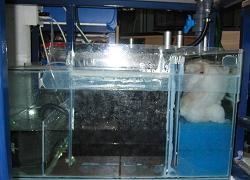 Unter dem Aquarium befindet sich ein Filterbecken. Das Beckenwasser läuft zunächst rechts über Filterwatte und blauen Filterschaum, dann in der Mitte über einen Rieselfilter gefüllt mit bio balls und wird links von einer Eheim 1060 mit einer Leistung von 2200 l/Stunde wieder zurück ins Becken gepumpt.