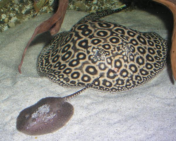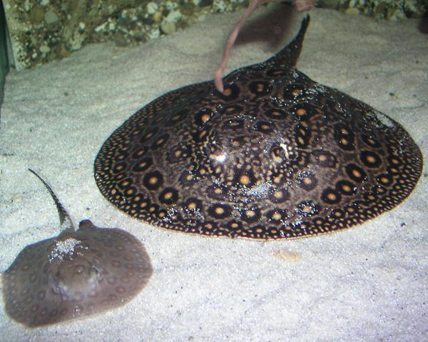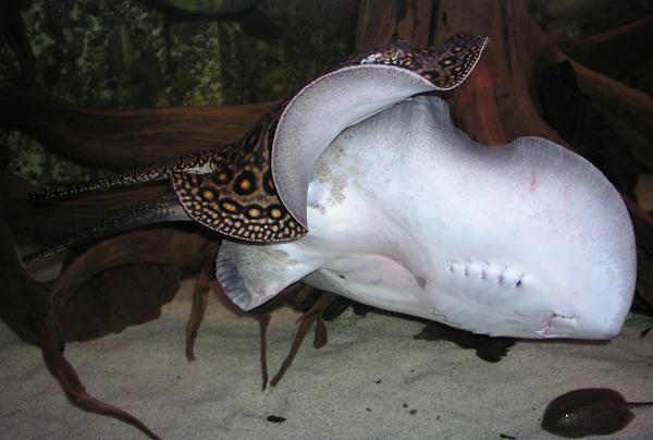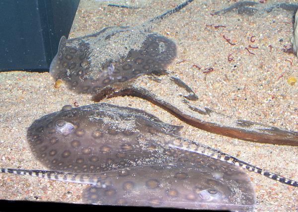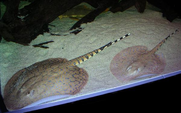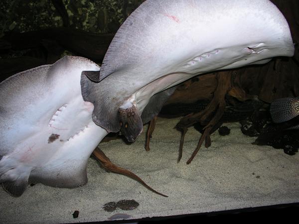 Im kleineren Becken schwimmt neu ein junges Paar Tigerrochen. Das jüngere Weibchen hat bis vor zwei Wochen nur lebende Würmer gefressen. Unterdessen frisst sie wie das Männchen auch rote Mückenlarven. Seit ich sie habe (1,5 Monate) hat sie schon zugenommen. Bis sie so gut genährt ist wie das Männchen dauert es aber schon noch einige Zeit. Die Tigerrochen sind sehr aktiv. Eingegraben sind die beiden Tiere nie. Die Temperatur ist im Becken auf 30° eingestellt.