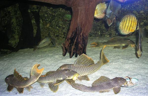 Im selben Becken sind: 5 ausgewachsenen L 14, einen L 256, einige L 90 und einen Schwarm Discus. Die Geophagus altifrons "Xingu" die auf dem Bild zu sehen sind schwimmen unterdessen auch im grösseren Becken.