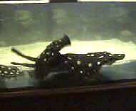 Nachdem um 22.00 Uhr das Licht über dem Becken ausging, schwamm das Weibchen wieder in die Ecken und krümmte sich. Das sieht dann immer so aus, als ob sie die Jungen rauspressen wollte. So zog es sich bis um 22.50 Uhr hin. Bis sie dann wie von der Tarantel gestochen eine große Runde schwamm und die Jungen im Flug verlor.