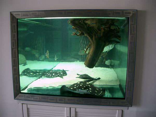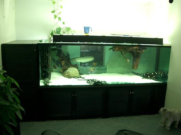 Das Becken hat die Maße 280cm x 110cm x 80cm, Glasstärke 19mm. Dieses ist die Ansicht vom Wohnzimmer. Das Becken ist aber auch aus dem Flur (rechte Seite) und aus der Küche (von Hinten) einsehbar. Die Filteranlage befindet sowohl links neben dem Becken aus auch im Unterschrank.