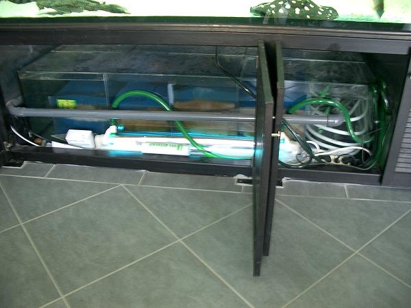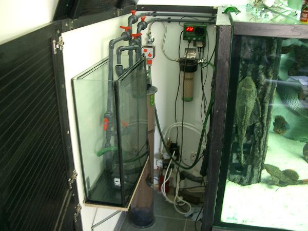 Unter dem Aquarium befindet sich ein Filterbecken mit 400 Litern Inhalt. Das Wasser wird mit einer Eheim Pumpe 3500l/h zurück ins Becken befördert.