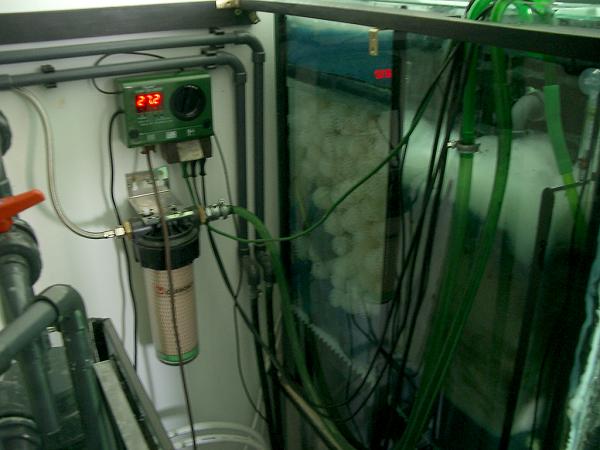 Am linken Bildrand befindet sich der Nitratfilter mit 15 Liter Nitratharz. Eine 1500l/h Pumpe befördert das Wasser aus der Klarwasserkammer des Biofilters über die grauen Rohre (Bild oben) durch die Säule und wieder zurück in den Biofilter.