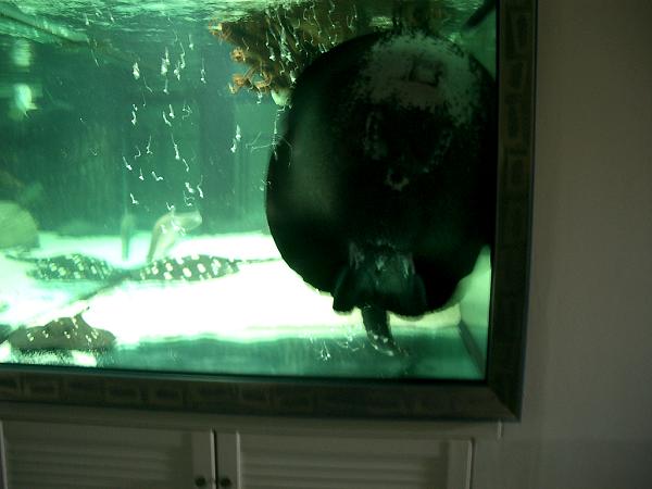Das große Weibchen bei seiner Lieblings Beschäftigung: Scheibenschwimmen! Die weißen Punkte im Wasser sind vom Rochen eingezogene Luftblasen.