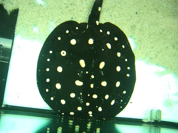 In der Mitte eine weibliches Nachzuchttier. Diesen Rochen habe ich im Mai 2003 mit einem Durchmesser von 13cm erstanden. Heute ist er 22cm groß.