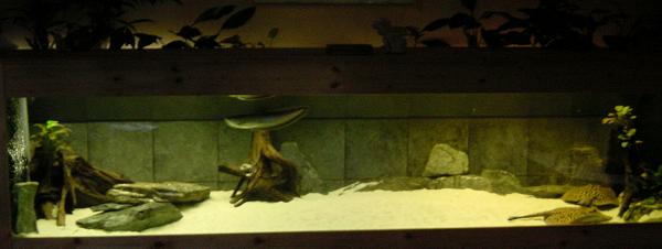 Es befinden sich 3 Mangrovenhölzer und mehreren Steine im Aquarium, welche aber so angeordnet sind, dass man den Rochen nicht zu viel Platz wegnimmt. Den Bodengrund bilden 100 kg weißer Sand.