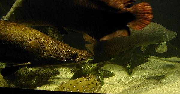 Die Amazonasanlage, hier leben P. motoro mit verschiedenen Buntbarschen und Arowanas zusammen.