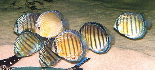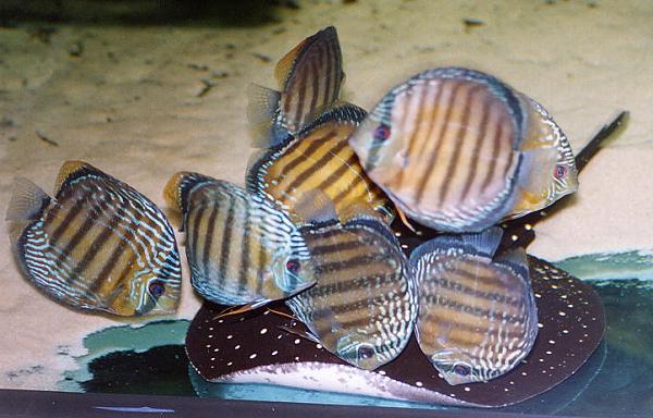 Als letztes ist noch eine Gruppe Diskusfische hinzu gekommen. Trotz vieler Warnungen wollte ich es ausprobieren und siehe da, bis jetzt keine Probleme. Man muß natürlich abwarten wie sich die Größe der Rochen entwickelt, wobei die P 14 scheinbar nicht mehr wachsen. Sollten die Perlenrochen Motoroausmaße annehmen, muß ich mir mit den Diskusfischen sicherlich etwas einfallen lassen, aber natürlich auch mit den Perlenrochen. Schaun wir mal. |