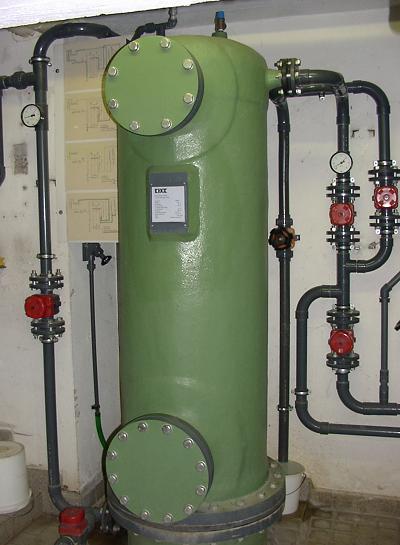 Der Druckfilter, 2,20m hoch, 0,6m Durchmesser und 600 Liter Inhalt.
