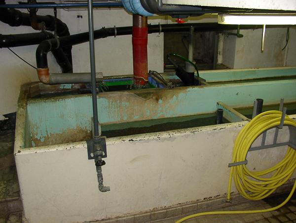 Dann fließt das Wasser in die Tiefzisterne, die über 1 Million Liter Wasser fasst. Hierhin gelangt auch das Wasser aus einigen anderen Süßwasserbecken. Am Boden der Tiefzisterne bildet sich mit der Zeit eine Schlammschicht, in der ebenfalls Abbauprozesse stattfinden. Ein Teil des Zisternenwassers wird kontinuierlich durch frisches Leitungswasser ersetzt. Aus der Zisterne werden dann wieder 4 m³/h in die Rochenanlage gepumpt.