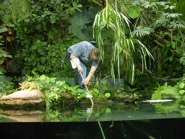 Zum Reinigen der Rochenanlage und um Jungrochen herauszufangen wird der Wasserspiegel im Becken bis unterhalb der Glasscheiben abgesenkt. Die Pfleger laufen dann mit Gummistiefeln im Becken herum und dirigieren die großen Rochen mit Stöcken hin und her. Dabei kam es bisher noch nicht zu größeren Zwischenfällen, Herr Giseler wurde einmal von einem jungen Rochen in den Finger gestochen, was zwar schmerzhaft war (als würde man ein brennendes Feuerzeug unter den Finger halten) aber ohne Probleme verheilte und eine Kollegin wurde durch den Gummistiefel gestochen, aber da ist die giftige Stachelhaut außen am Gummistiefel hängengeblieben und es ist auch nicht viel passiert.